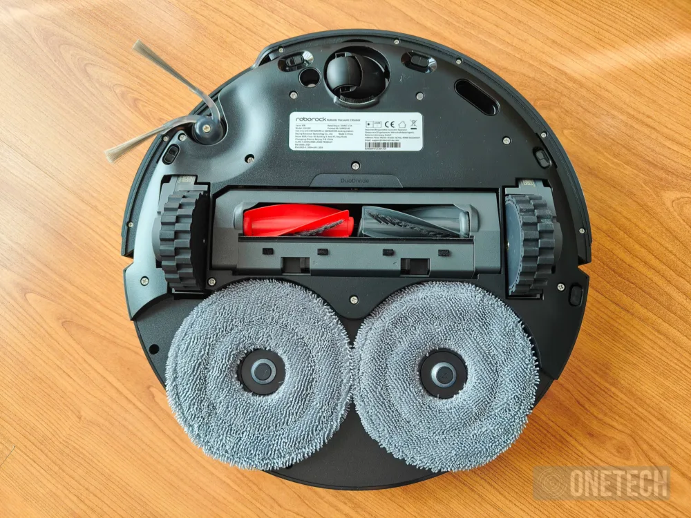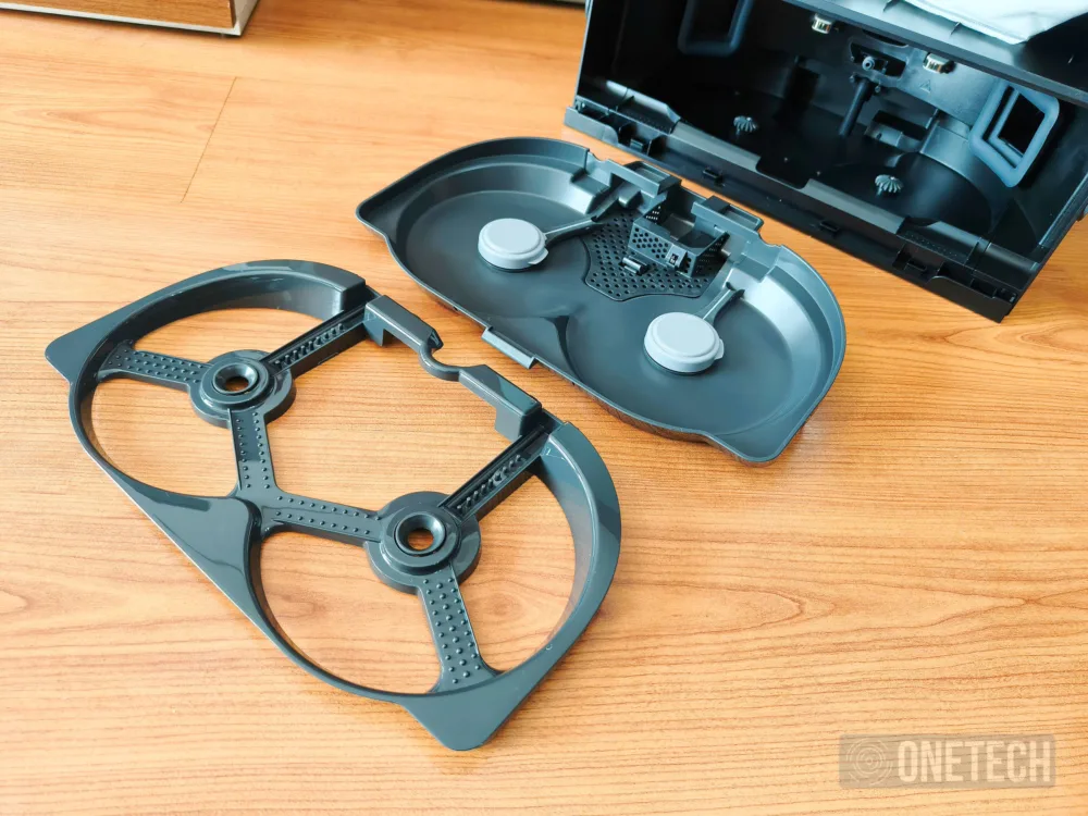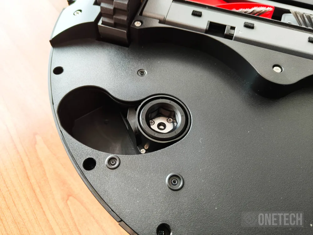 El robot nos llega sin las mopas circulares instaladas, lo que nos permite ver los huecos donde estas encajarán de forma magnética. Uno de estas no está fijo, sino que está instalado en una especie de riel en forma de semicírculo, el cual sirva para que cuando estemos fregando una de las mopas circulares se despliegue fuera del cuerpo del aspirador, llegando así a zonas como los rodapiés o el contorno de los muebles.