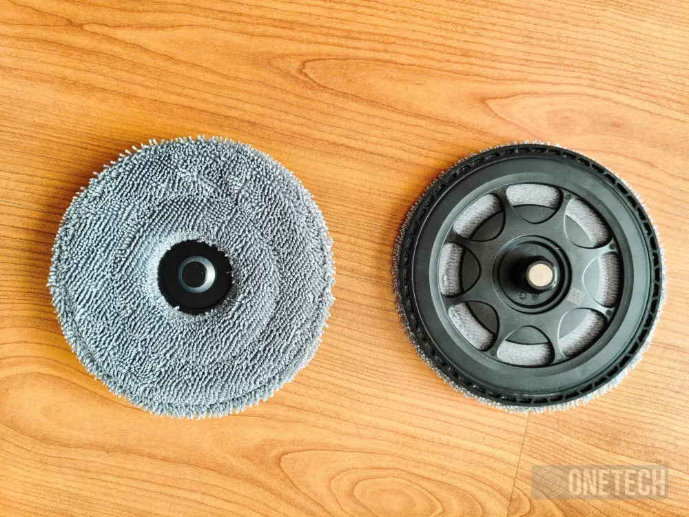 Las mopas fijas que ocupaban todo el ancho del robot ha dejado paso a nuevos sistemas de fregado, desde rodillos a mopas giratorias como las del Saros 10R. Se trata de dos mopas con un centro de plástico donde un pilar sostiene un imán que se usa para unirse al robot. Esto permite que podamos colocarlos o retirarlos con facilidad, algo que también hace de forma automática la base multifunción cuando es necesario.