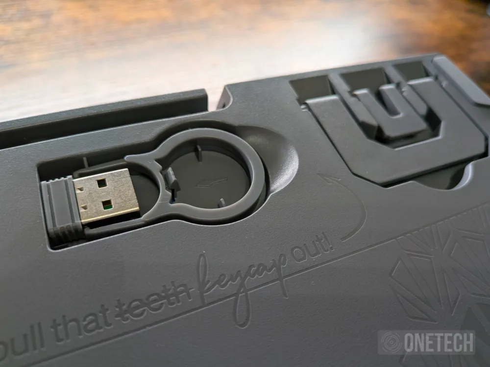 En esta zona encontramos también un rebaje donde se han colocado tanto el receptor inalámbrico USB, como la herramienta de extracción para teclas e interruptores. Ambos se extraen usando presión, lo mismo que necesitaremos para volver a colocarlos.