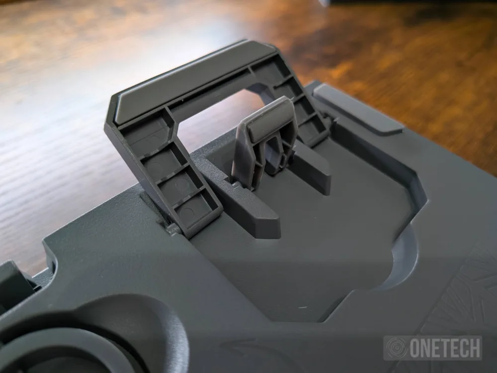 Si bien el puerto USB C es personalizado, esto solo le aporta un extra de seguridad en la unión, pudiendo usar otro cable con conector estándar si nos hiciera falta. También vemos como Endorfy ha incluido un sistema de enrutamiento del cable, lo que nos permite guiarlo de forma que salga por la parte posterior o tirando hacia los laterales.