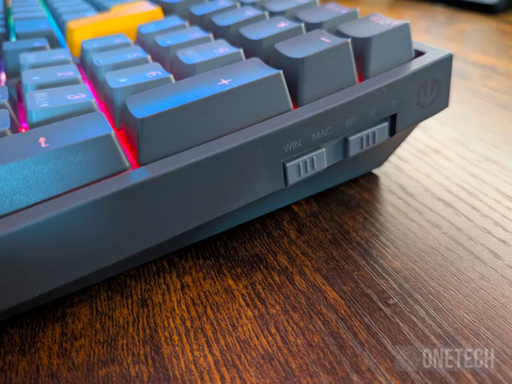 Cambiar del «modo» Windows a Mac es lo más sencillo que te puedes imaginar con el teclado de Endorfy. La compañía ha colocado en la parte derecha del teclado un deslizable que nos permite pasar del modo Windows a Mac al instante. Lógicamente, si quieres que las teclas acompañen deberías cambiarlas. Esto está pensado para que escojas un modo predeterminado con el que personalizar el teclado y usar día a día, pero que siempre puedas pasar al otro modo al instante si lo necesitas.
