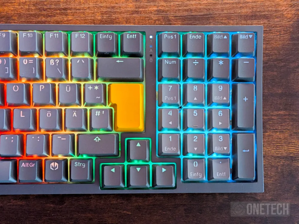 Estos interruptores también nos permite disfrutar de una iluminación RGB personalizable mediante software, que ciertamente es más llamativa de lo que me esperaba, no tanto por su brillo y potencia, sino por como se expande de forma que ocupa todo el fondo del teclado, dándole un aspecto realmente llamativo que me ha gustado. Eso sí, los grafismos de las teclas no son lo mejor para dejar pasar esta iluminación, viéndose ligeramente opacada.