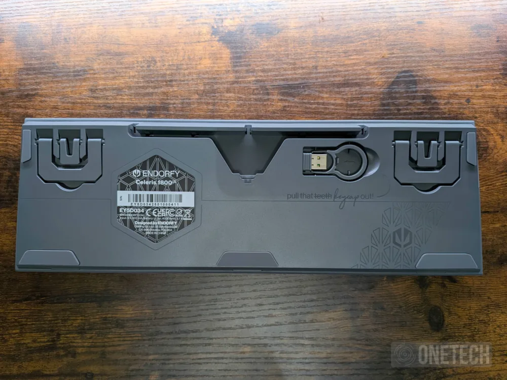 Si le damos la vuelta al teclado lo primero que nos llama la atención es la ausencia de tornillos, algo que se debe a que este teclado está construido usando un diseño de unión por encaje a presión, el cual se complementa con un interior donde dos gruesas capas de relleno se silicona reducen las vibraciones y ruidos del tecleo.