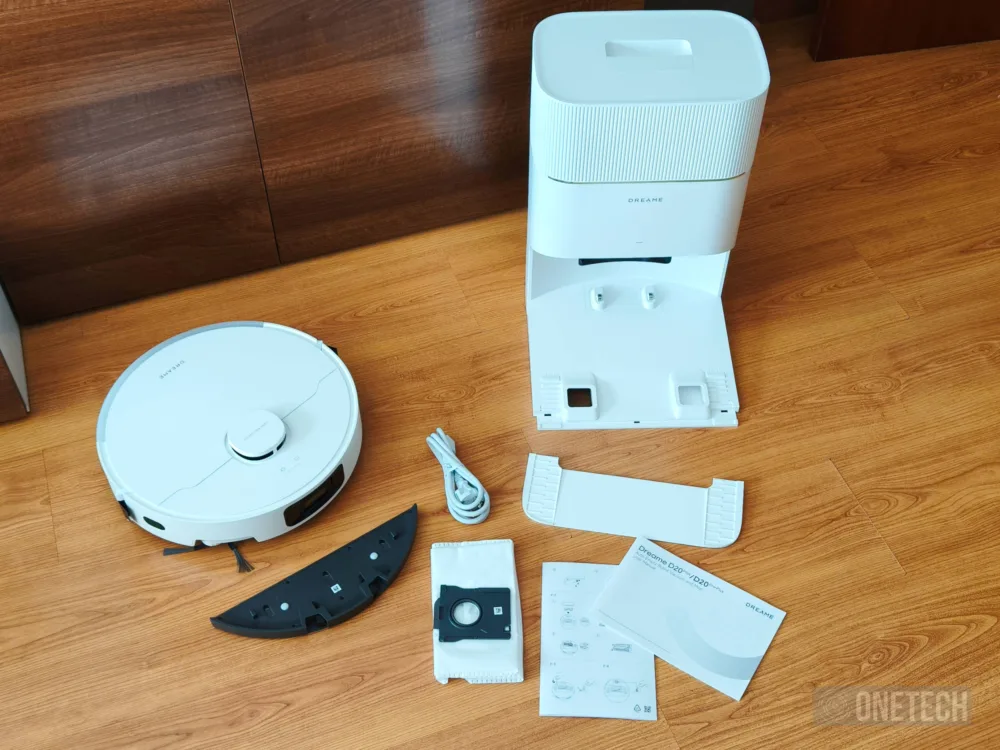Desplegando todo sobre el piso de nuestro hogar encontramos que el Dreame D20 Plus nos llega en color blanco, al igual que todos los componentes. Tenemos el propio aspirador, la base de carga y autovaciado junto a su rampa para el aspirador, una mopa, una bolsa extra para el polvo y el habitual conjunto de folletos indicativos. Todo lo necesario para montar y comenzar a usar nuestro robot.