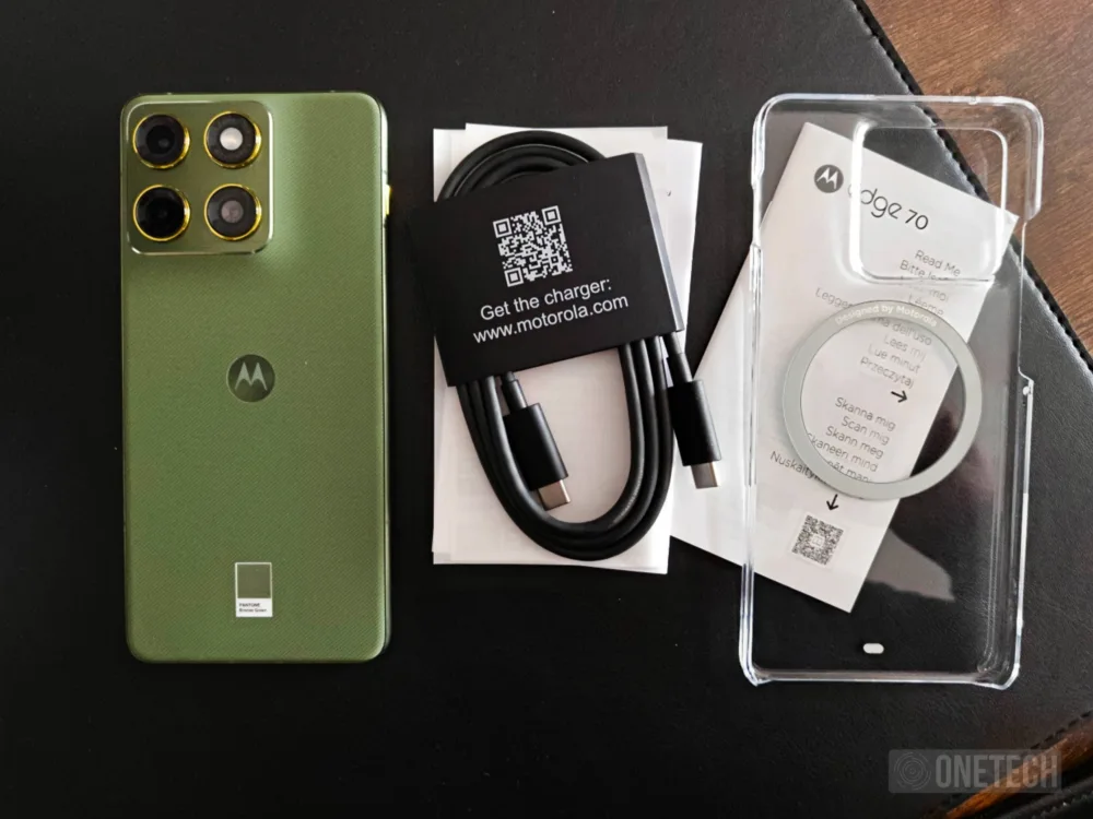 Desplegando todo lo que encontramos en la caja, junto con el Motorola Edge 70, en mi caso con el acabado Bronze Green, nos llegan un cable USB tipo C a cable USB tipo C, la habitual herramienta extractora para la bandeja de la SIM y una funda protectora magnética rígida de acabado transparente. Motorola también afirma que nos viene un aroma distintivo del embalaje, pero debe ser que yo estaba refriado y no olí nada. Por supuesto no falta ni la guía, ni la información de seguridad que acompaña a este tipo de dispositivos.