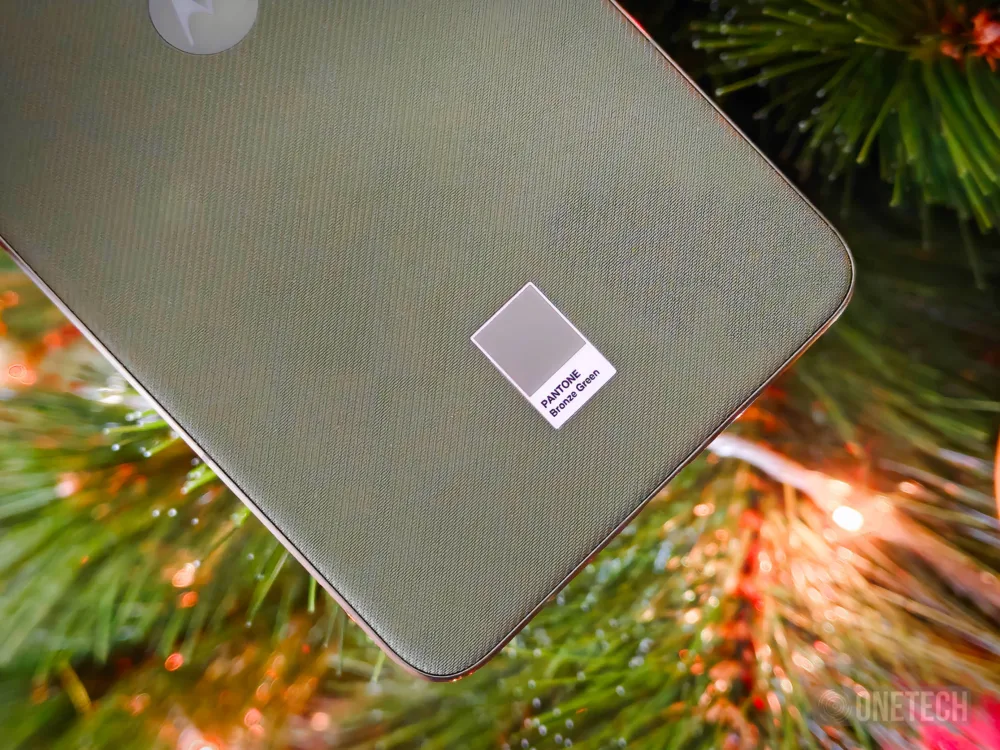 En mi caso cuento con el mencionado acabado Bronze Green, aunque también lo encontramos en Pantone Lily Pad, Pantone Gadget Grey e Pantone Cloud Dancer. Cuando lo sacamos de su caja lo primero que llama la atención es su color, pero también su textura, ya que Motorola se ha inspirado en el Nylon para ofrecer un acabado rugoso que se inicio parece tela, pero que en realidad está realizado en silicona.