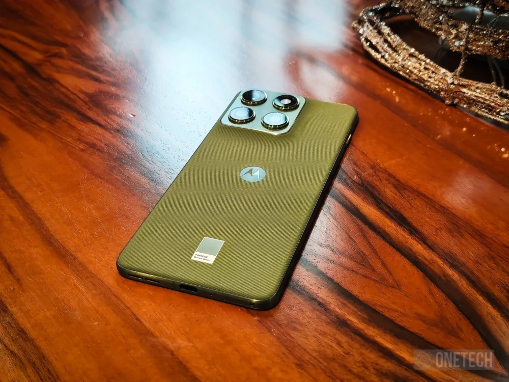 El tema del diseño es algo donde Motorola se esmera como pocos, ya lo vimos con el Motorola Razr 60 Ultra y más recientemente con el Signature. Esto se refleja en el aspecto general, pero también en esos pequeños detalles que nos encantan. Tanta las lentes de las cámaras traseras, como el botón de la izquierda dedicado a invocar las funciones IA, destacan sobre el fondo verde con un llamativo acabado dorado. Pintoresco, sin duda, y es que el Motorola Edge 70 no es para los que busquen diseños serios.