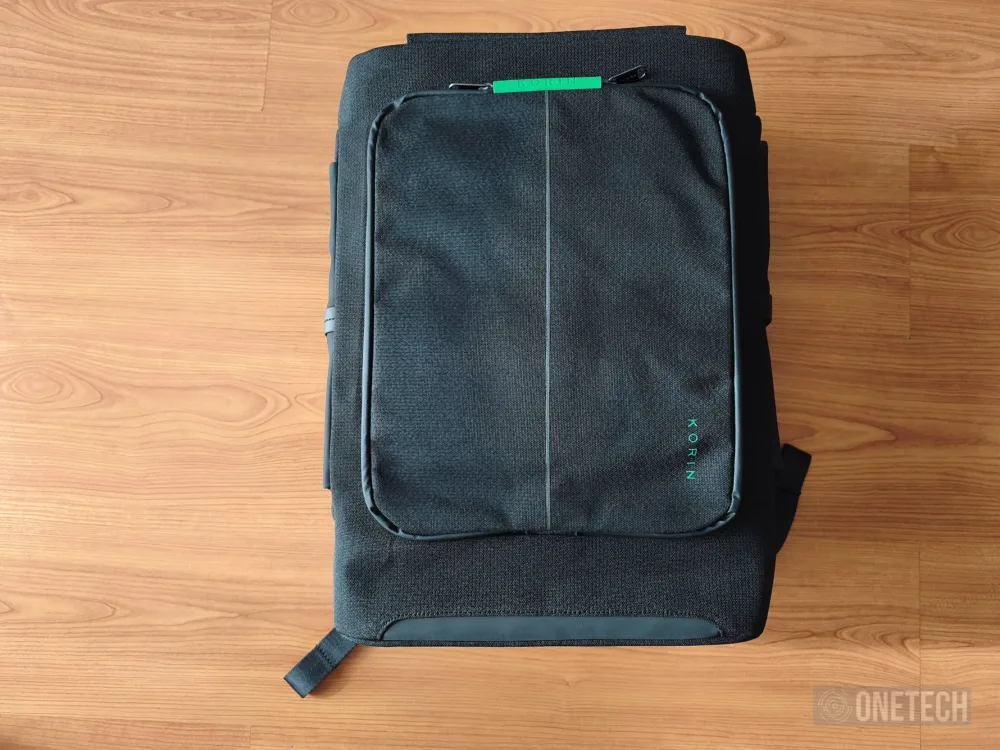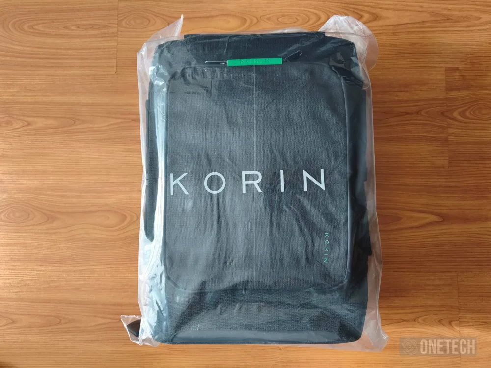 Como es norma comenzamos esta review mostrando como nos llega esta mochila, ya que no es una de las que vas a encontrar en la tienda, sino que debes comprarla online. Por ello no nos extraña que nos llegue en una caja de cartón para protegerla, algo que sin duda viene muy bien, ya que nos ha llegado con claros síntomas de la dureza del viaje. Con un fondo gris oscuro con un patrón de líneas negras, el verde se usa como color de acento, un estilo que también veremos en el propio diseño de la mochila. Korin destaca su marca y el nombre de la mochila junto a su diseño portable y fácil de usar. También menciona su diseño antirrobo, con almacenaje multifuncional y la integración de un sistema de carga rápido que nos va a facilitar la vida en los viajes y traslados largos.