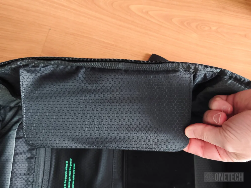 El primer compartimento lo encontramos en la parte superior, ya que la solapa que os mencionábamos anteriormente esconde un hueco pensado para que podamos colocar nuestras gafas. Este espacio se cierra de forma magnética, por lo que debemos tener en cuenta que es, con diferencia, la más accesible y menos segura de todas. En mi caso lo he usado de forma ocasional, ya que las gafas en un accesorio que solo necesito usar puntualmente, pero al que le he dado otros usos, como llevar un bálsamo labial y cosas similares que pueda necesitar coger rápidamente, pero que tampoco es algo que me preocupe perder.