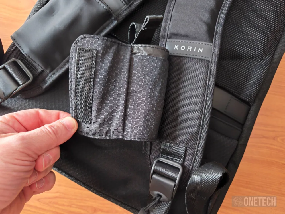 Los laterales de la mochila también ocultan bolsillos, con un total de tres, de uso muy distintos todos ellos. En primer lugar tenemos, mirando de frente en la parte derecha, lo que parece un bolsillo de gran altura con una banda en la parte media, pero que en realidad se trata de dos bolsillos distintos. En la parte superior de esta zona tenemos un pequeño bolsillo, mientras que la banda intermedia oculta un segundo bolsillo, siendo esta banda un seguro por si lo que colocamos en ese bolsillo sobresale del espacio interior. Sin embargo Korin se guarda una sorpresa y es que la base del bolsillo superior está sujeta con velcro, por lo que si la despegamos nos encontramos con que tanto el bolsillo superior como inferior se comunican, dejando la opción de usar ambos como un único gran bolsillo vertical.