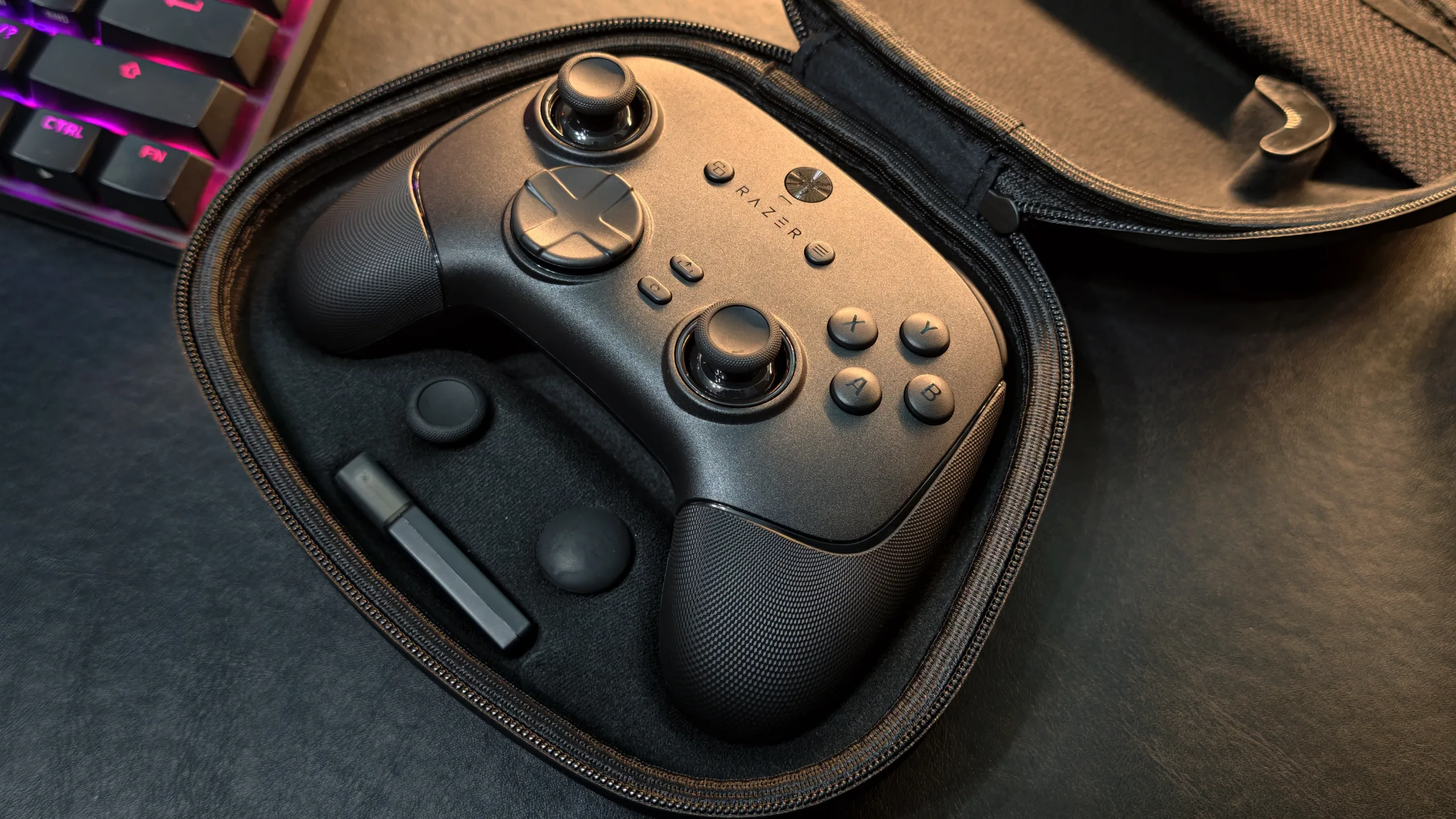 Cuando compramos el nuevo mando de Razer, no debemos de preocuparnos por dónde guardar cada uno de sus elementos incluidos. En el estuche que se incluye con el empaquetado, encontramos espacios para guardar tanto el mando como dos tapas para los joysticks, el dongle de conexión y una bolsita mallada que podemos utilizar para guardar el cable. Con esto, podremos llevar nuestro mando a cualquier lugar, permitiendo transportarlo todo de forma ordenada y segura.