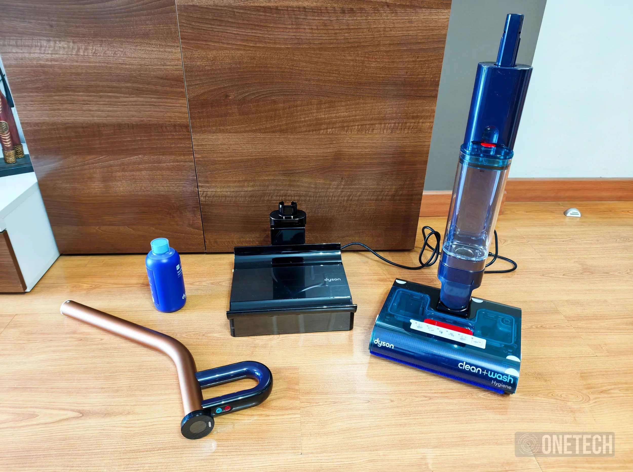 Al retirar todos los componentes de la caja, descubrimos que Dyson no quiere complicarnos la vida con montajes farragosos donde tengamos que lidiar con multitud de secciones a unir. Aquí lo que tenemos es tan simple como: una base de carga y secado con su cable correspondiente, el propio aspirador/fregona y el mango que deberemos incrustar en su parte superior. Además, Dyson incluye un pequeño bote de su solución probiotica, la cual destaca por ser totalmente inocua y libre de tóxicos, al tiempo que integra una serie de organismos probióticos que son capaces de metabolizar los contaminantes y la suciedad de forma que siguen trabajando, incluso tiempo después de haber pasado la fregona.