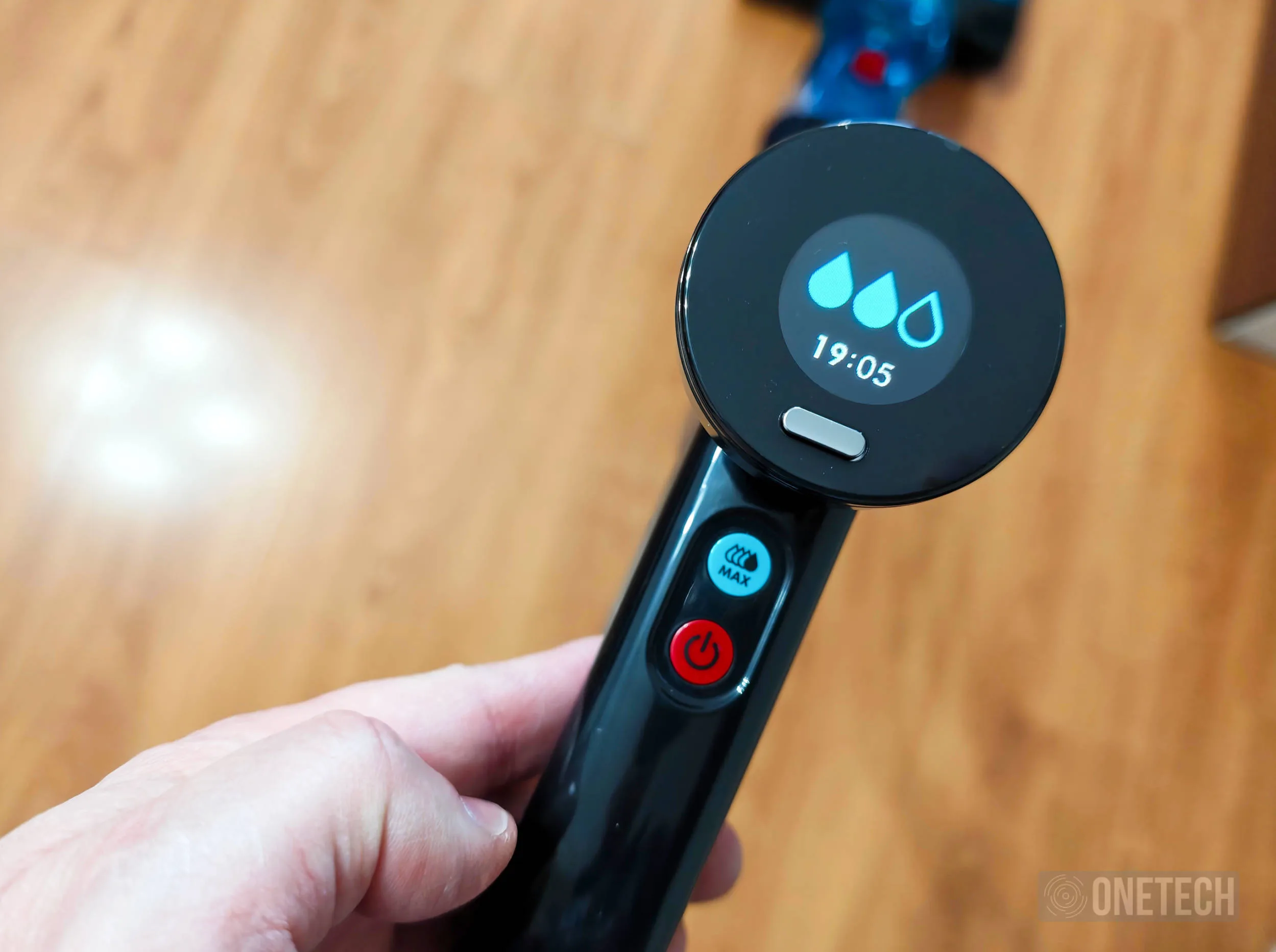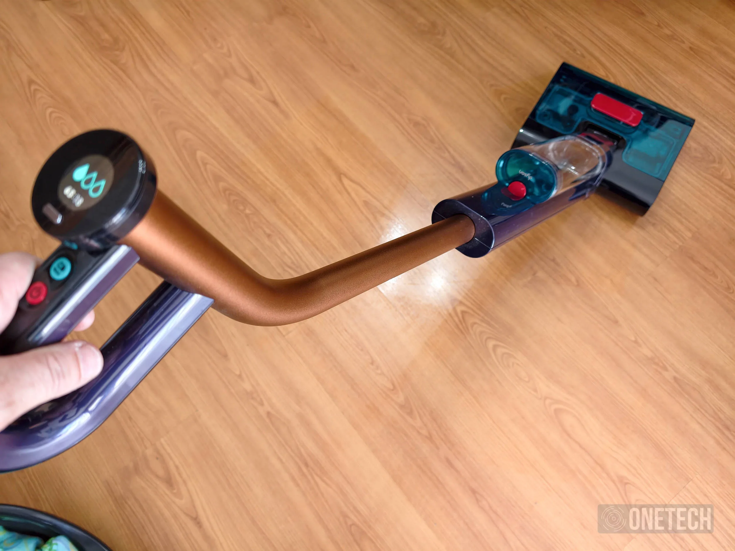 Como sistema de control tenemos en la parte superior del mango tres botones. Con ellos podemos encender y apagar la fregona, regular la cantidad de agua que se usa en la limpieza, e incluso usar el modo «Max» cuando necesitamos un aporte extra de agua y potencia para limpiar un punto en concreto. Para poder tener una visión más clara de lo que pasa, sobre estos botones tenemos una pequeña pantalla a color donde podemos ver que potencia estamos usando, pero donde también veremos información útil. Por ejemplo, cuando tenemos que limpiar la base, en esta pantalla se nos mostrará como extraer y limpiarla, algo muy visual y cómodo de usar.